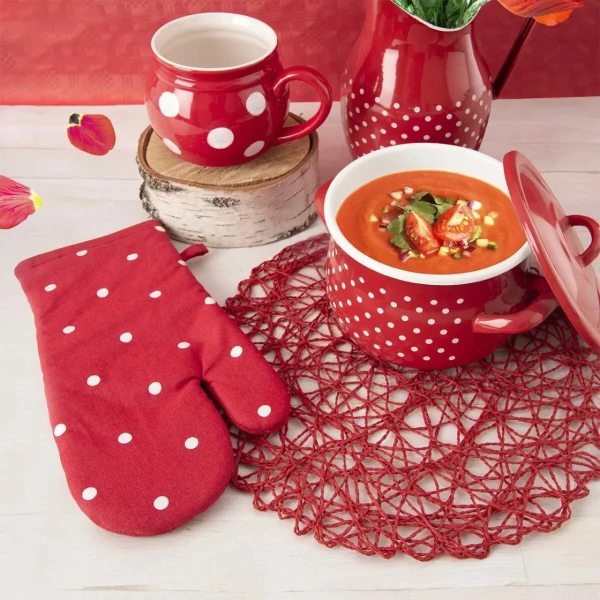 Vďaka integrovanému magnetu ju možno jednoducho pripevniť na kovové povrchy, ako je chladnička alebo rúra, takže ju budete mať vždy poruke. Dizajn s bodkovaným vzorom dodáva chňapke moderný a hravý vzhľad.