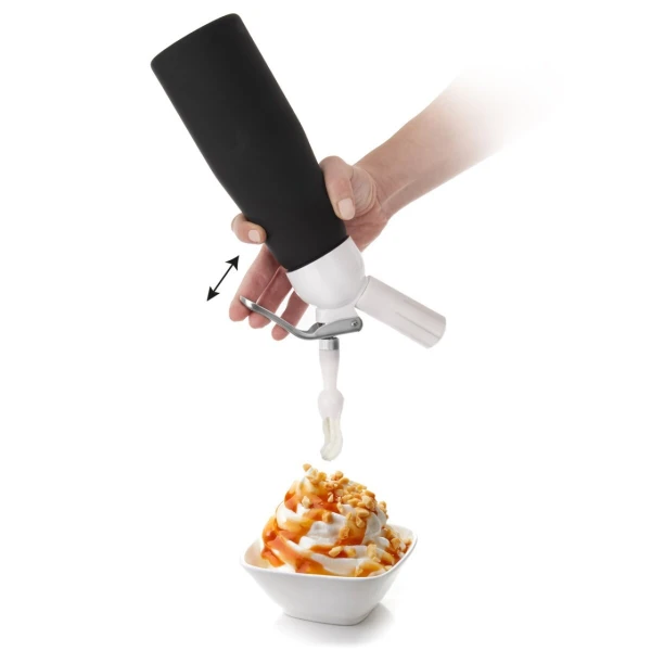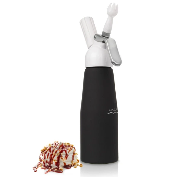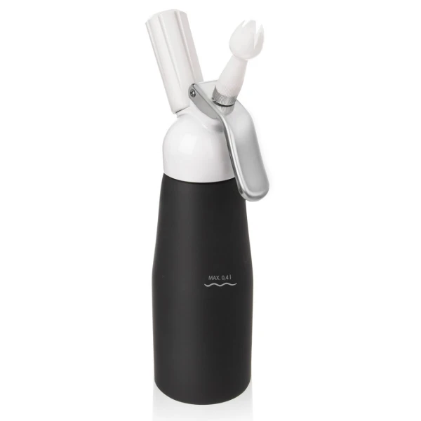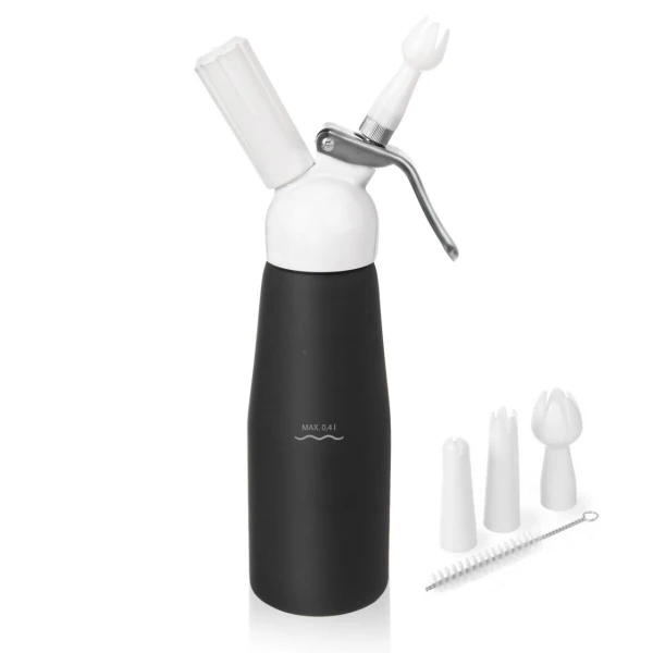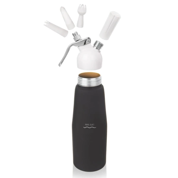 Praktickým pomocníkom, ako si počas chvíle pripraviť kvalitnú šľahačku zo smotany na šľahanie, je odolná hliníková nádoba so silikónovým tesnením, so skrutkovacou hlavou, tryskou, tromi nástavcami a čistiacou kefkou. Vďaka nim je možné vytvoriť nadýchanú šľahačkovú ozdobu na vašich tortách, dezertoch, palacinkách, vafliach, zmrzlinových a ovocných pohároch, ale zjemníte aj omáčky a polievky alebo vytvoríte sladké a slané peny.