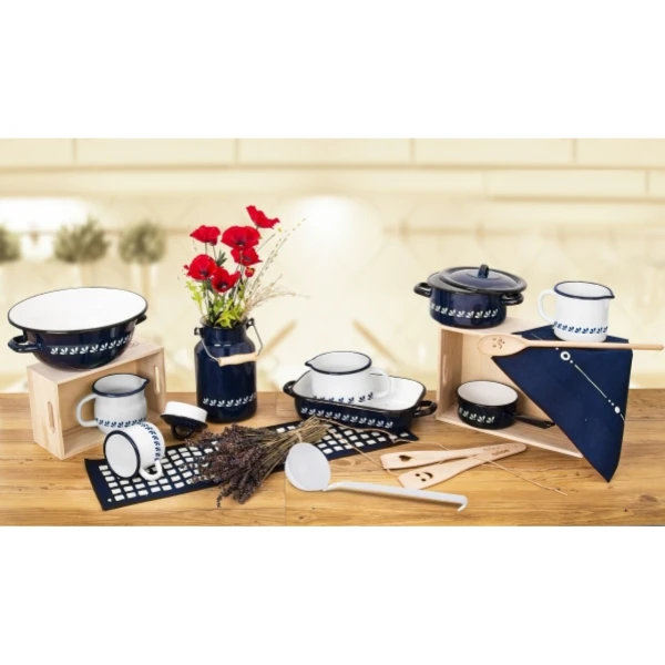 Krásna smaltovaná retro kanvička inšpirovaná modrotlačou, tradičnou technikou potlače textilu. Zdobí ju nežný dekor drobných bielych lístkov.