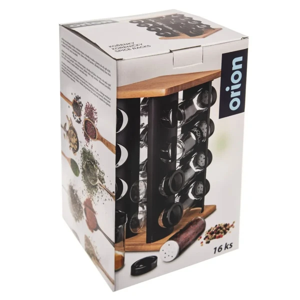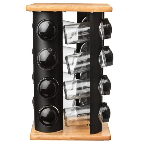 Dizajnový otočný drevený stojan s čiernymi nerezovými lištami s otvormi, ktorého súčasťou je 16 kusov sklenených koreničiek priemerom 4,5 cm a výšky 10 cm. Každá má plastové sypátko a čierne viečko. Podľa vloženého korenia alebo dochucovadla tak môžete sypátko ponechať alebo ho dáte dole a pohodlne nasypete a vysypete väčšie kúsky, napr. nové korenie, klinčeky.