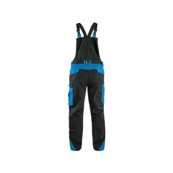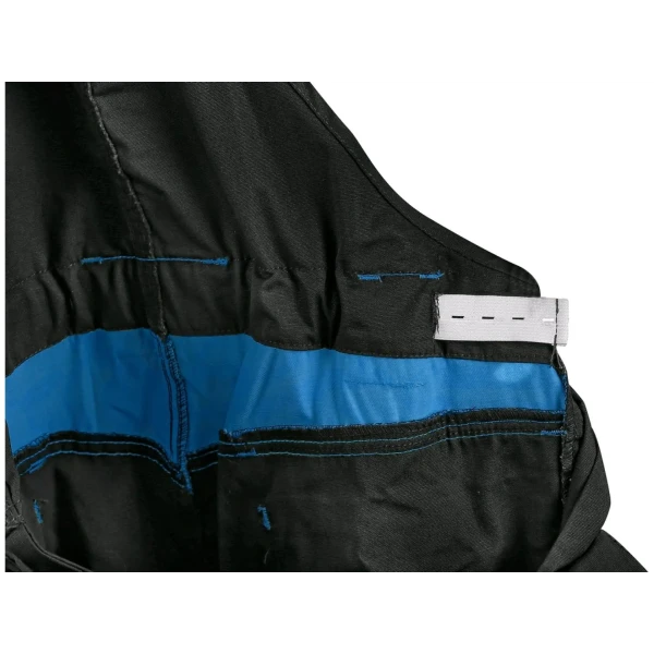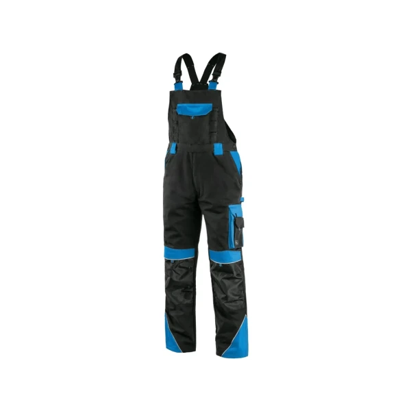 Pánske monterkové nohavice na traky, náprsné vrecko s chlopňou, pás s pútkami na opasok, v zadnej časti guma s gombíkom na prispôsobenie veľkosti, predné klinové vrecká, multifunkčné vrecká na oboch stranách, kolená zosilnené materiálom 600D polyester, s možnosťou vloženia kolenných výstuh. Dve zadné vrecká s chlopňami. Reflexné doplnky.