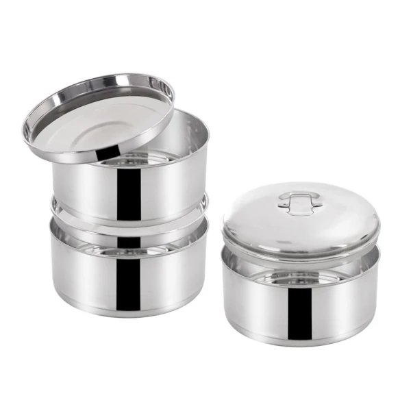 Termoobedár nerezový 4 poschodový na prenášanie pokrmov, ktorý dlho zachová ich teplotu.