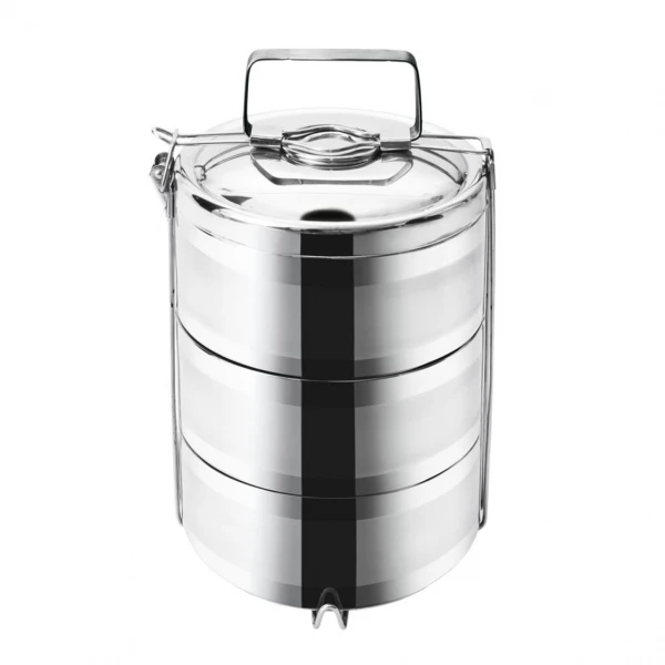 Termoobedár nerezový 3 poschodový na prenášanie pokrmov, ktorý dlho zachová ich teplotu.