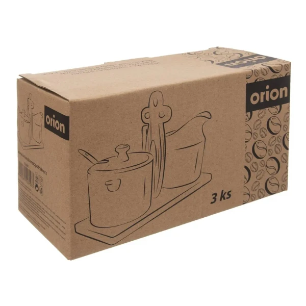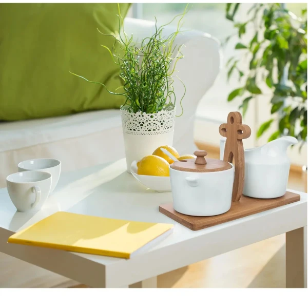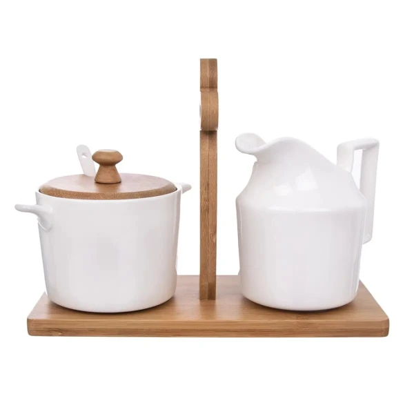 Krásne vyzerajúca porcelánová mliekovka a cukornička s vloženou lyžičkou a bambusovým viečkom. Obe nádoby s objemom 0,28 l sú usadené v bambusovom stojane s dekoratívnym držadlom.