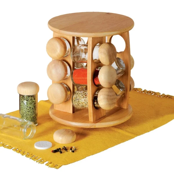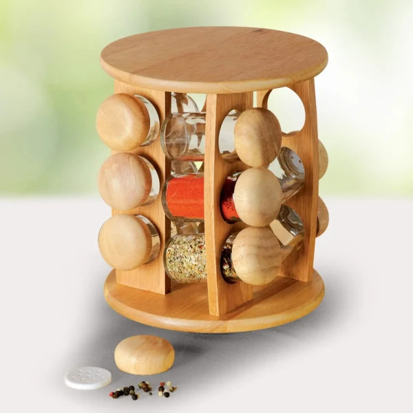 Absolútnou nutnosťou pri varení a pečení je perfektné dochutenie. Dizajnovým a zároveň praktickým pomocníkom je otočný drevený stojan s 12 koreničkami objemom 80 ml. Uľahčí vám hľadanie korenia a urýchli tak prípravu pokrmov.