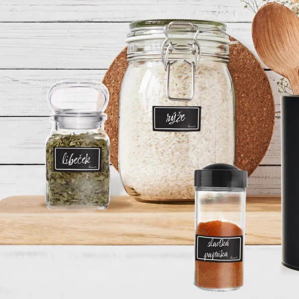 Nielenže tak rozlíšite dózy s cukrom, sypaným čajom, strukovinami a raňajkovými cereáliami, ale tiež môžete popísať poháre s domácimi kompótmi, nakladanými dobrotami aj fľaše s pálenkou či sirupom, ktoré budú aj pekným hand made darčekom.