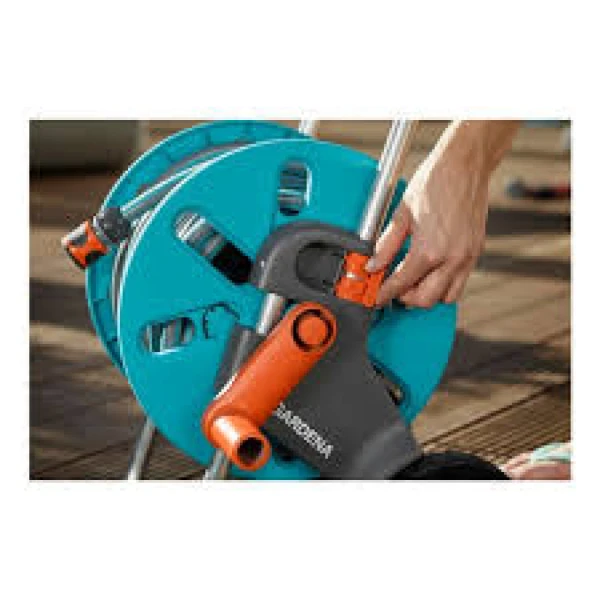 skladovanie záhradnej hadice. Hadica sa navíja pomocou veľkej pevnej kľuky.